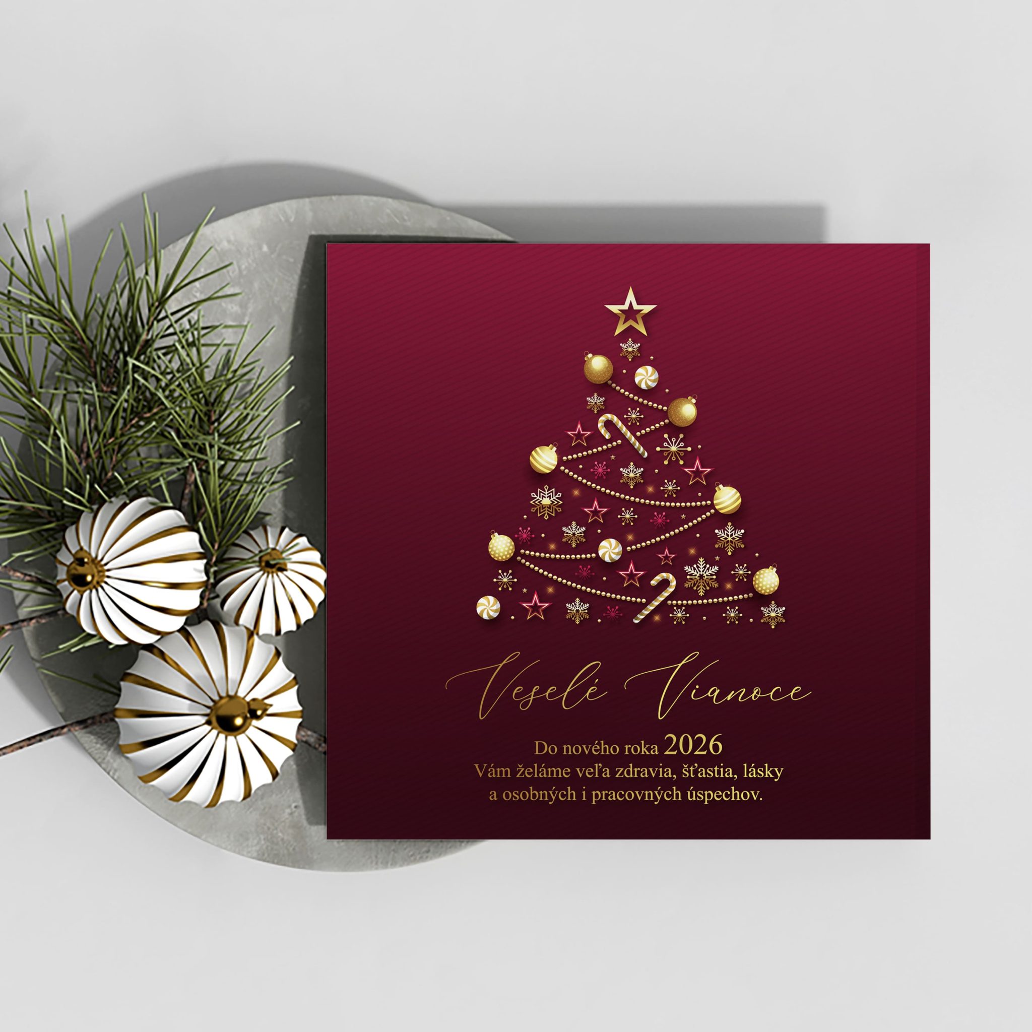 Vianočný pozdrav 2026_44 – bordový so zlatým stromčekom